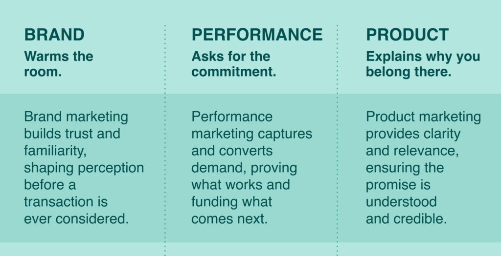 Each discipline strengthens the others. Brand makes performance more efficient. Performance provides feedback that sharpens product positioning. Product marketing gives brand and performance something solid to stand on.